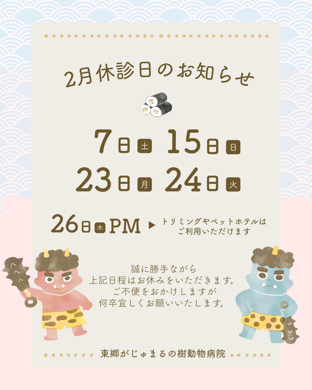 | 休診日 | : | 日曜・祝日午後 不定休有り。ご来院前に診療日カレンダーやお知らせをご確認ください。 |